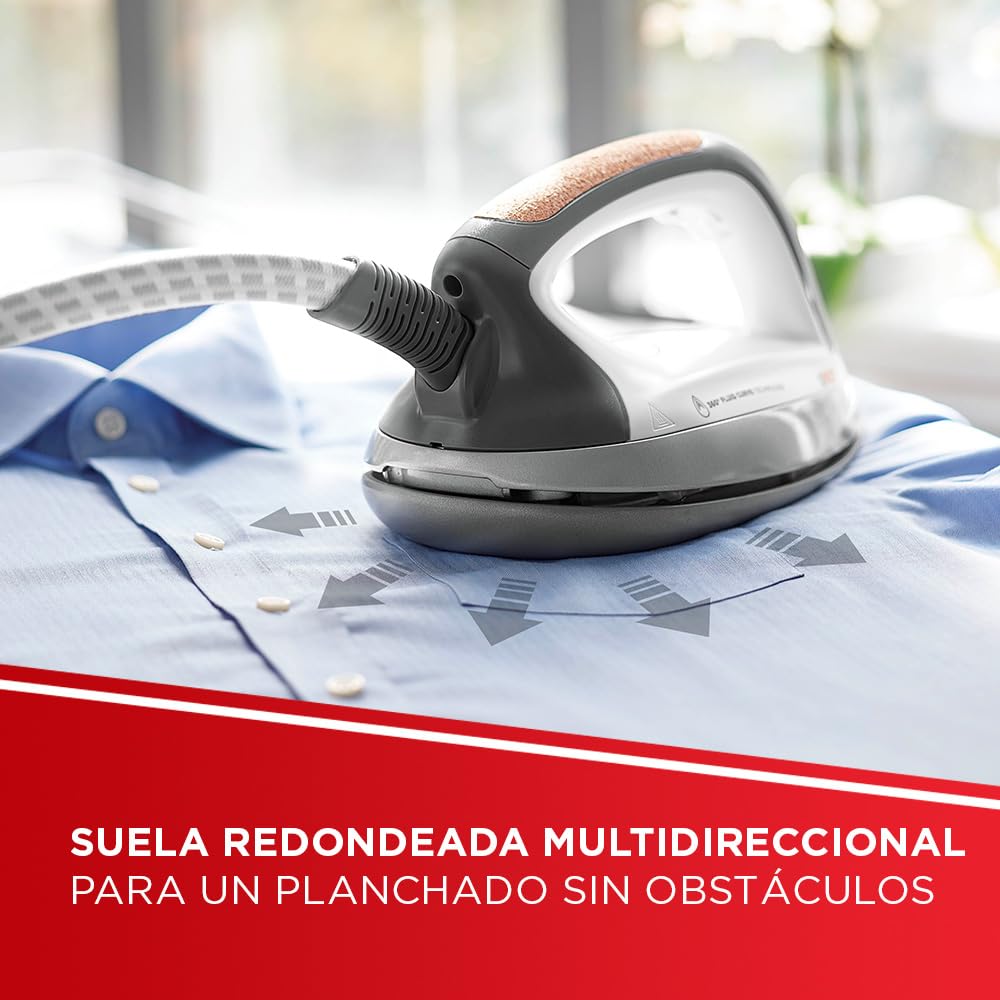 - Exclusiva suela 360° Fluid Curve Technology para resultados perfectos, óptimo deslizamiento, distribución homogénea del vapor, forma redondeada para un planchado multidireccional, autonomía ilimitada con depósito extraíble de 1.5 L