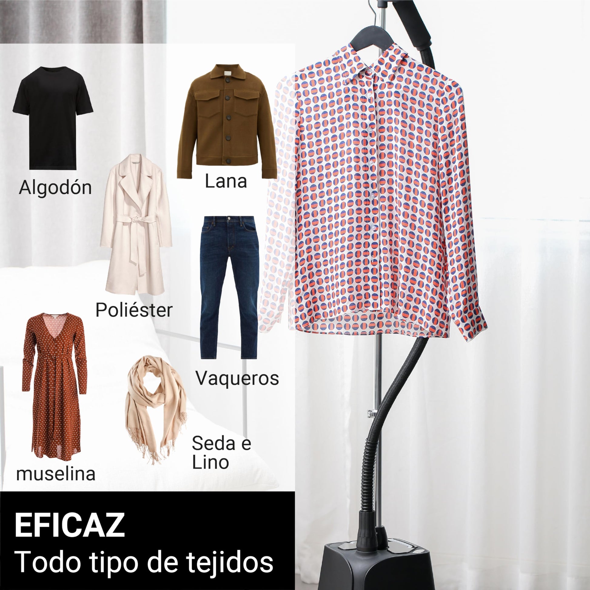 - INNOVADOR: la placa de acero inoxidable del vaporizador vertical ofrece una mejor calidad de planchado de las prendas y un chorro de vapor suave y continuo de 40 g/min para planchar sin riesgos todos tus tejidos.